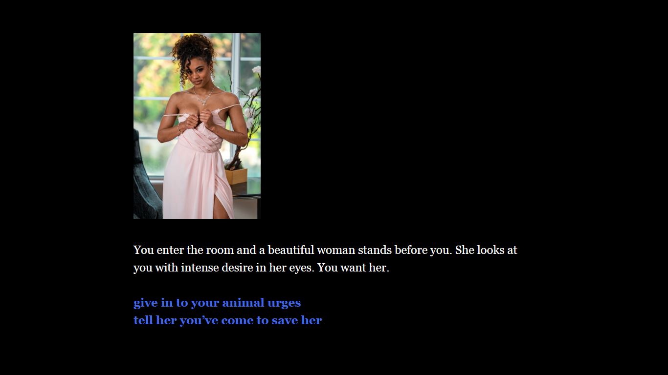 An adult Twine game called “Africa Unexplored.” It is an adult game that follows an adventurous European on his exploration of an African town in the year 1794.