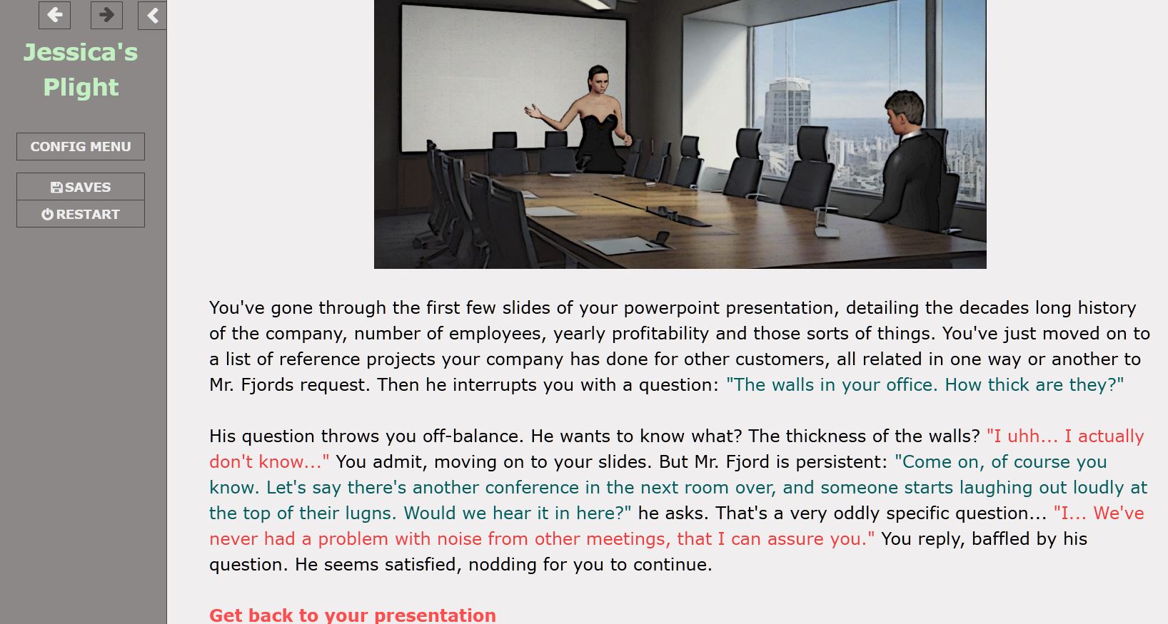 In this story, you play as Jessica, a 23-years old woman. Follow her story that quickly lands her in all sorts of sexy trouble at the office!