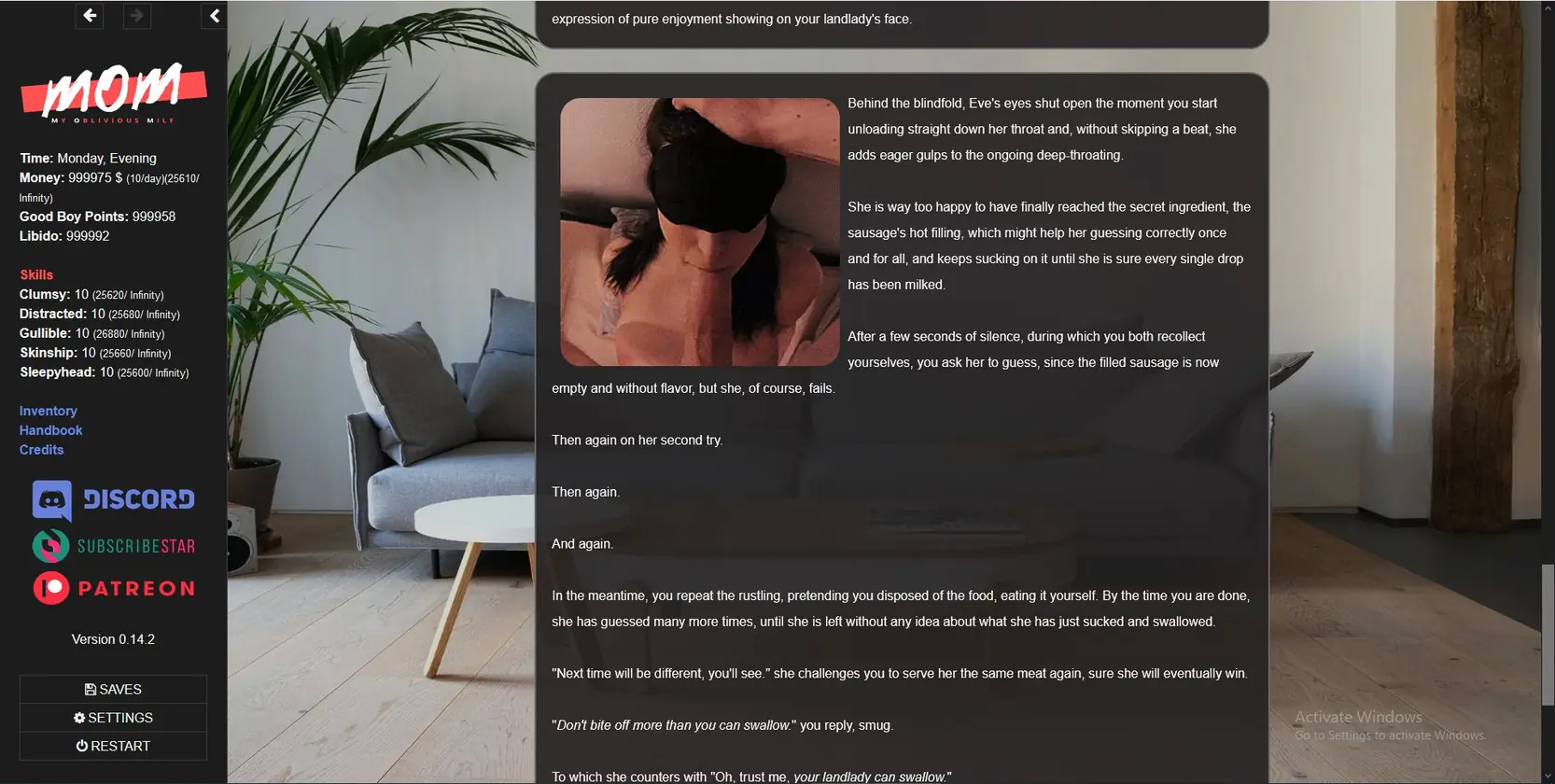 My Oblivious MILF is a text-based interactive erotic fiction with RPG elements created in Twine/Sugarcube. While all choices matter, some have effect immediately, some after a while, some permanently affect the game.