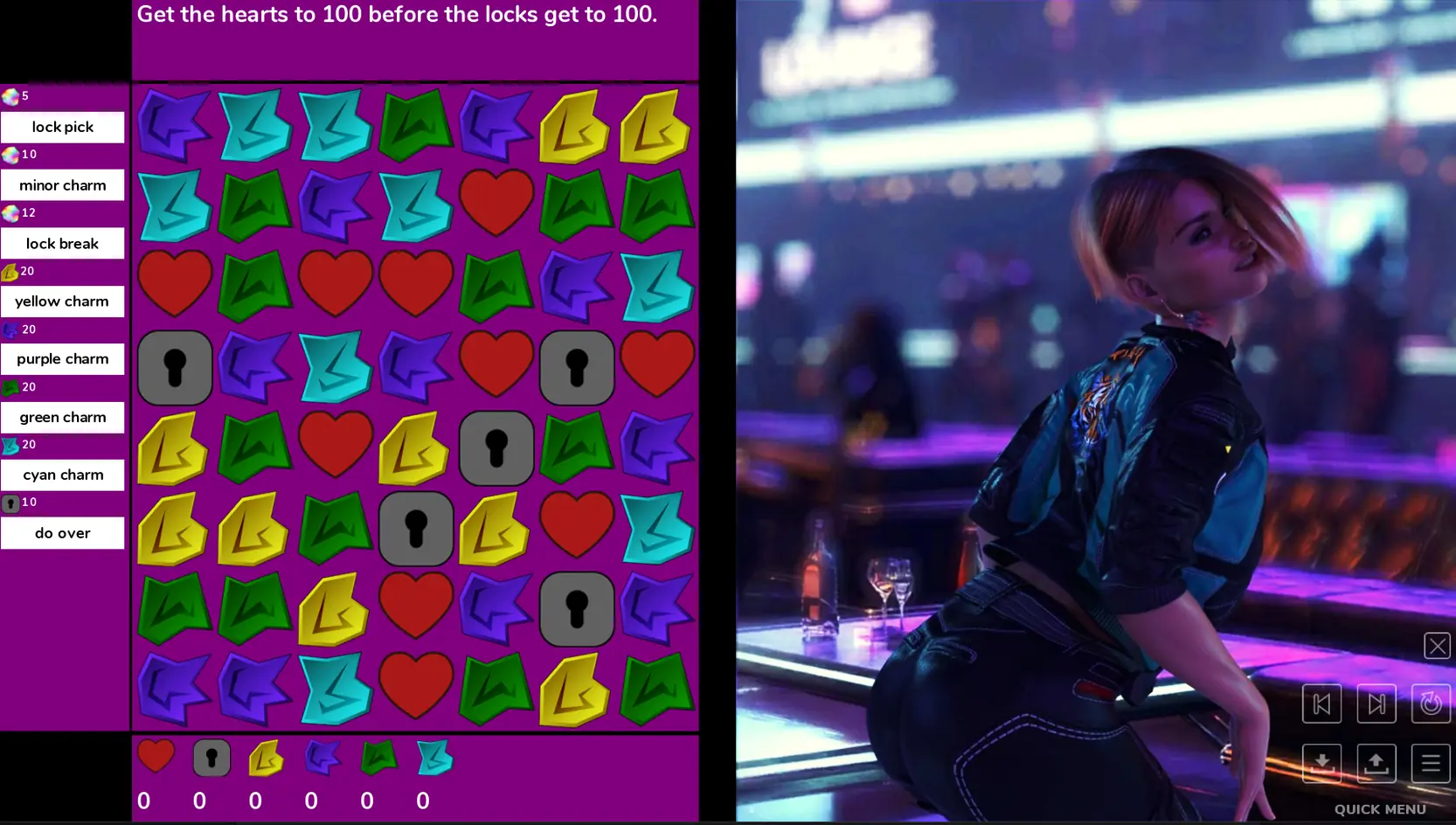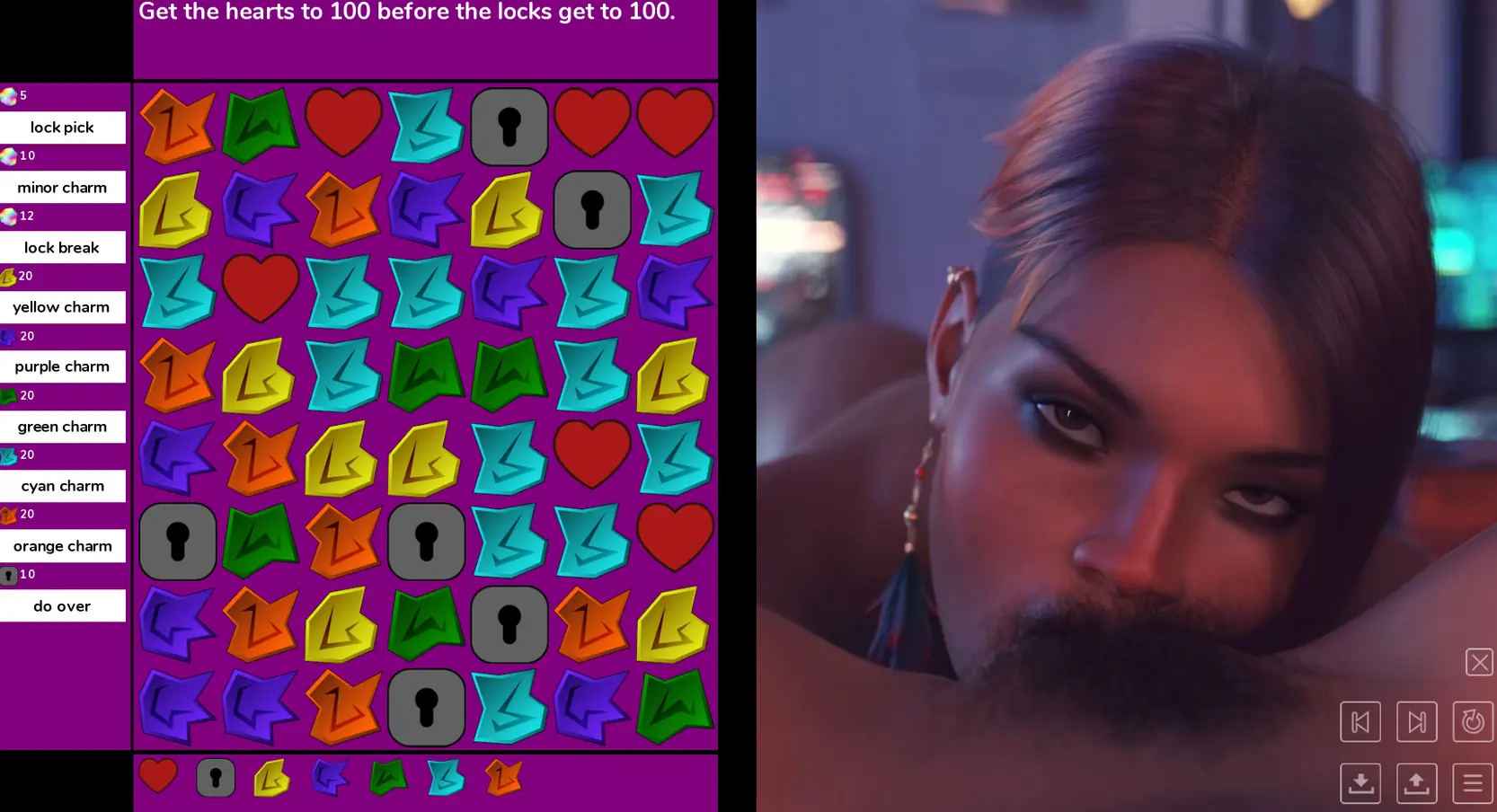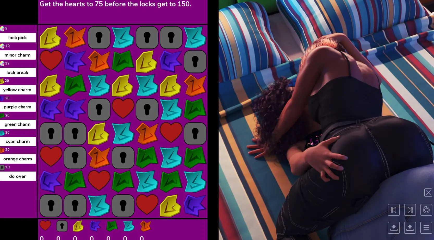 Puzzle Date is a side project that I wrote while Mortze was working on SWM. It is quite different than our other games. Although it has multiple sex scenes and some semblance of a story, including a Male path and a Lesbian one, it’s really a Match3 game where the Match3 parts are a metaphor for what is going on in the date. Go in with eyes open.
