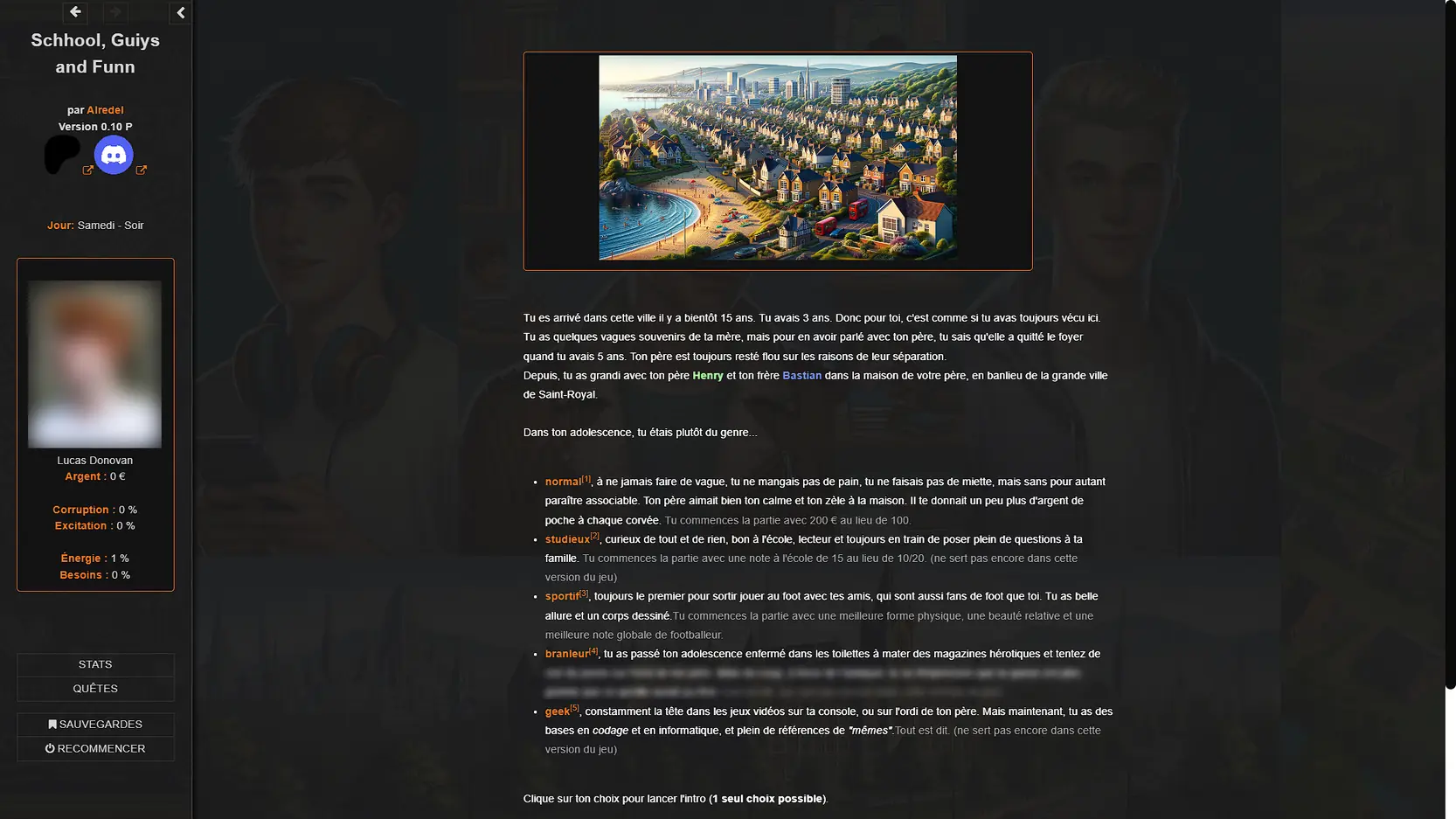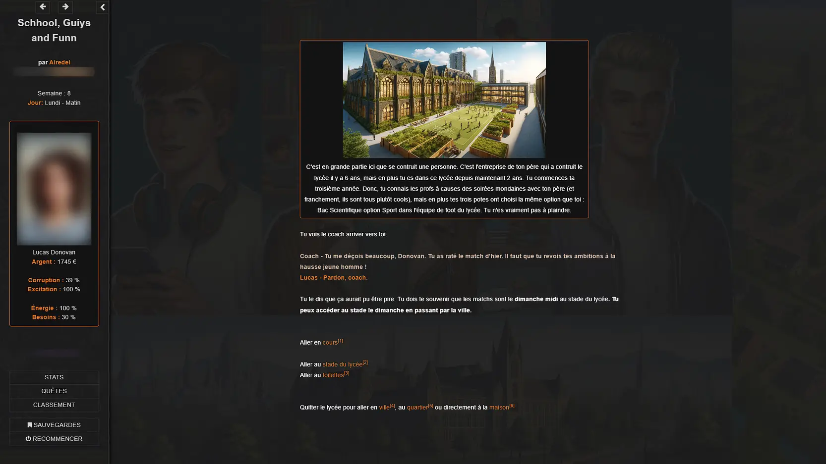 You play as Lucas Donovan (by default), who is starting his first year in a sports-study program for football (soccer) at a modern and fairly new high school, whose generous sponsor and builder is your father. He is a well-known and influential figure in the construction and real estate world, making you “the son of-“, which gives you certain privileges.