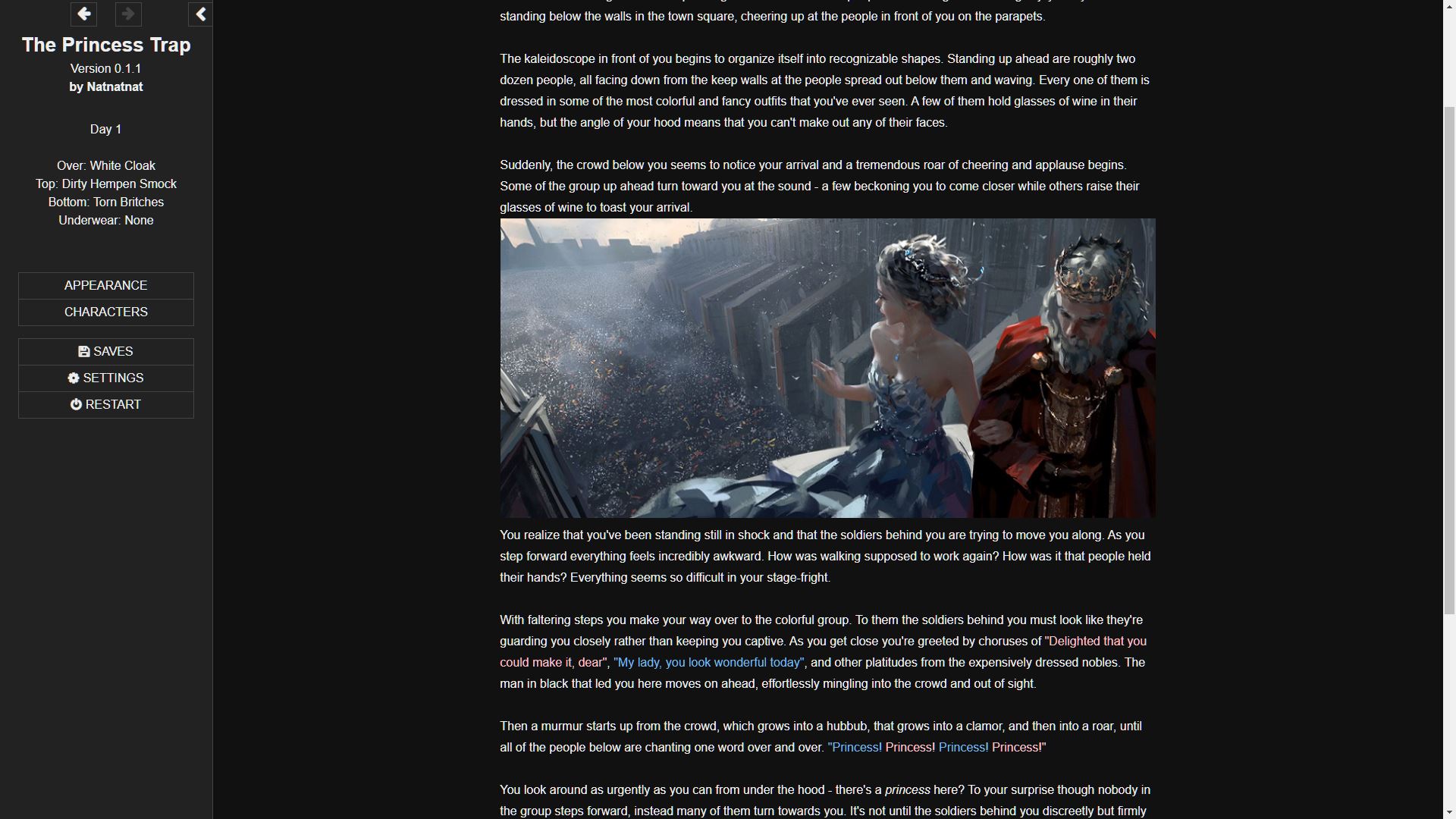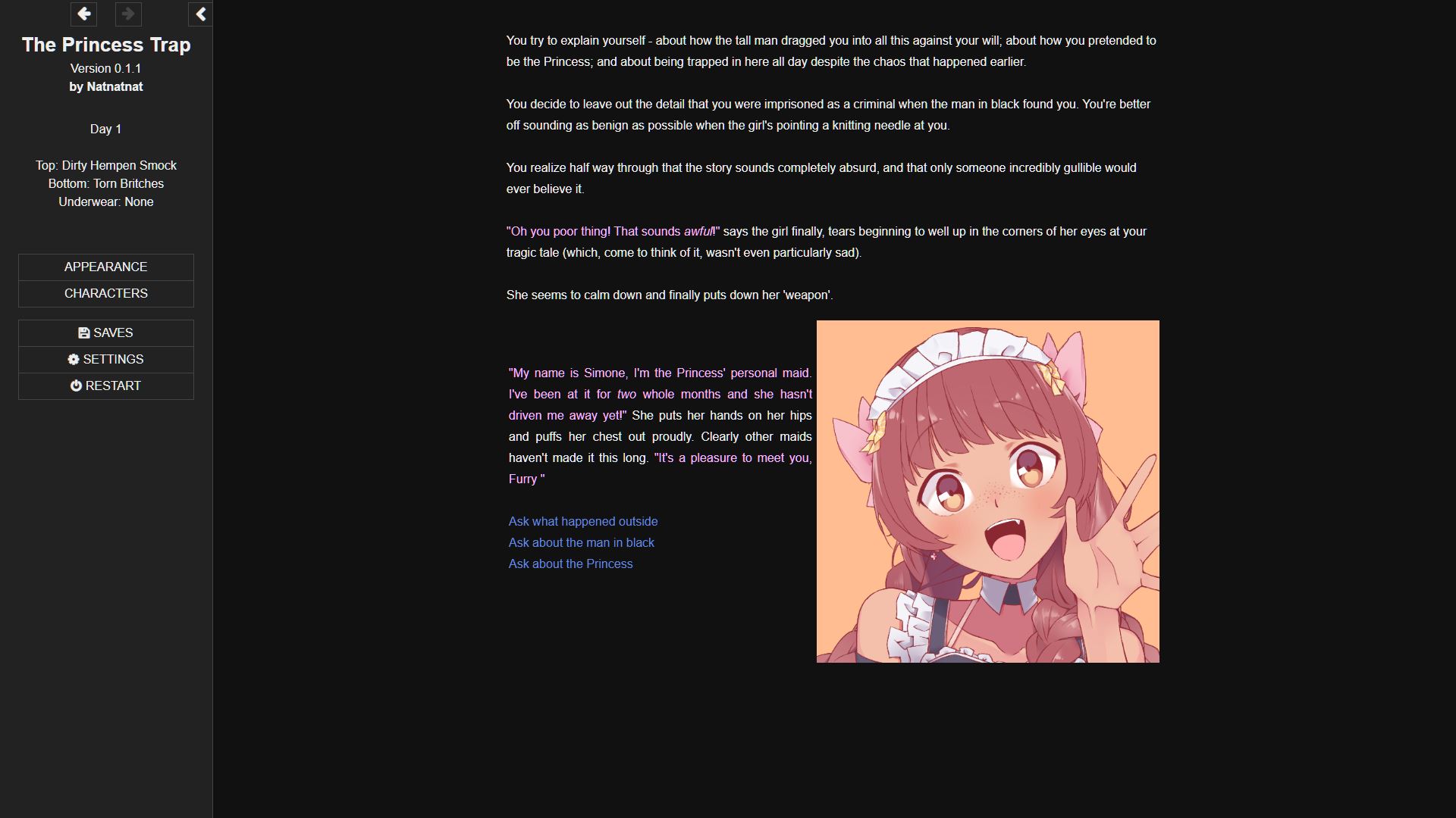 -Encounter the standout line "The slut ensorceled my fucking cock"-Adds a new, heroic option when asked for your opinion of the situation on day 5.
