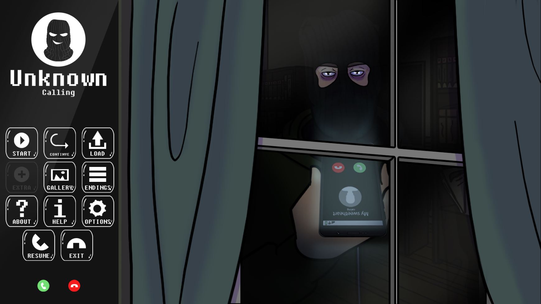 Unknown is a visual novel horror game focusing on an obsessive interaction with a stalker. Play as yourself as you navigate a phone call with this stranger that seems to know more about you then you do of him. Do your best to escape the situation that takes place next.